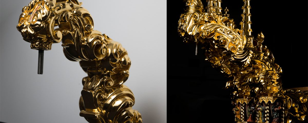 Siguiendo el diseño de Curro Claros, el taller de Alberto Berdugo ha realizado esta obra en madera de cedro real siguiendo la técnica de la talla directa. Para el dorado se ha empleado oro italiano de 23 cuartos de pureza de triple grueso.